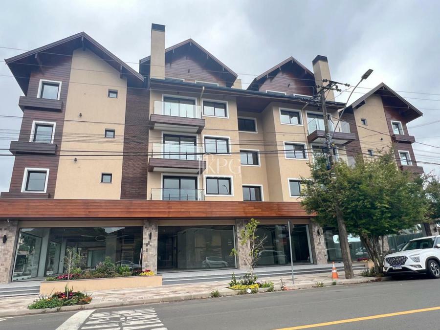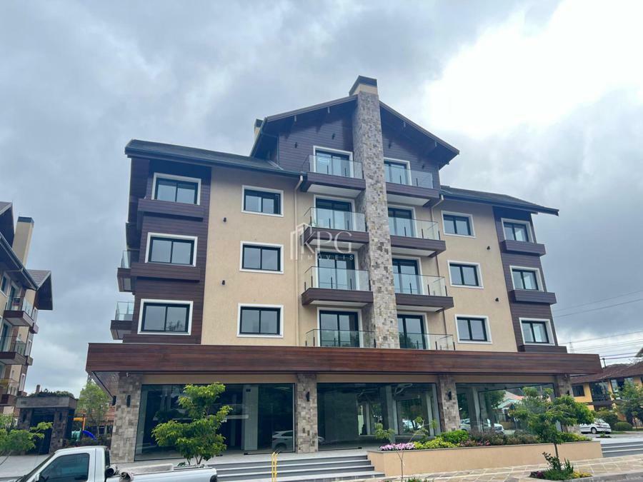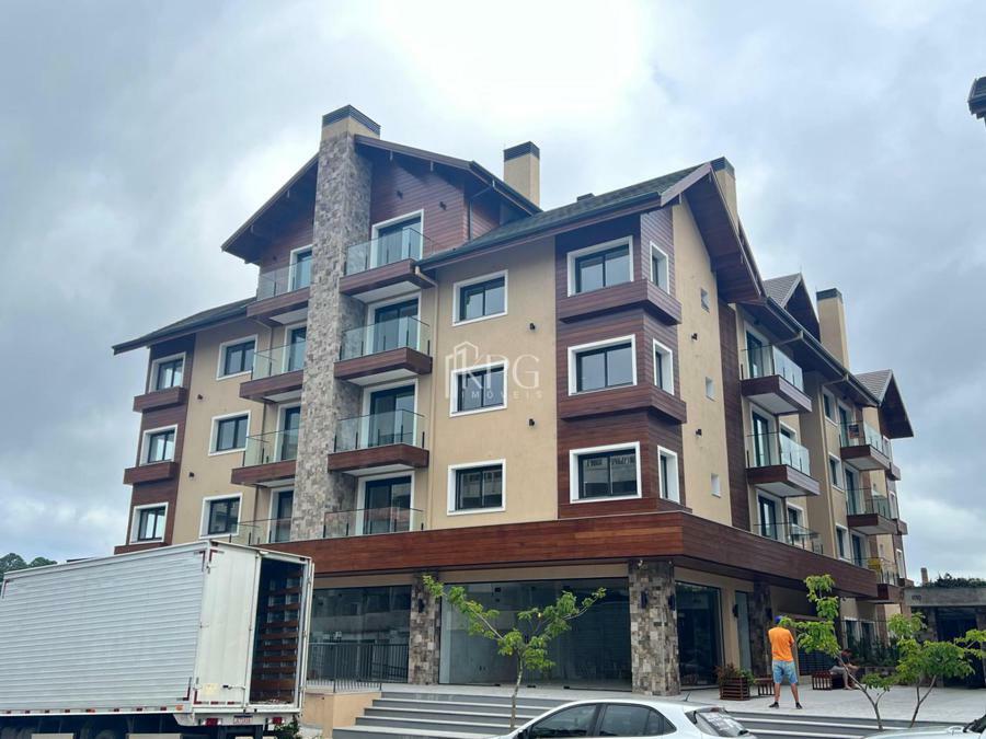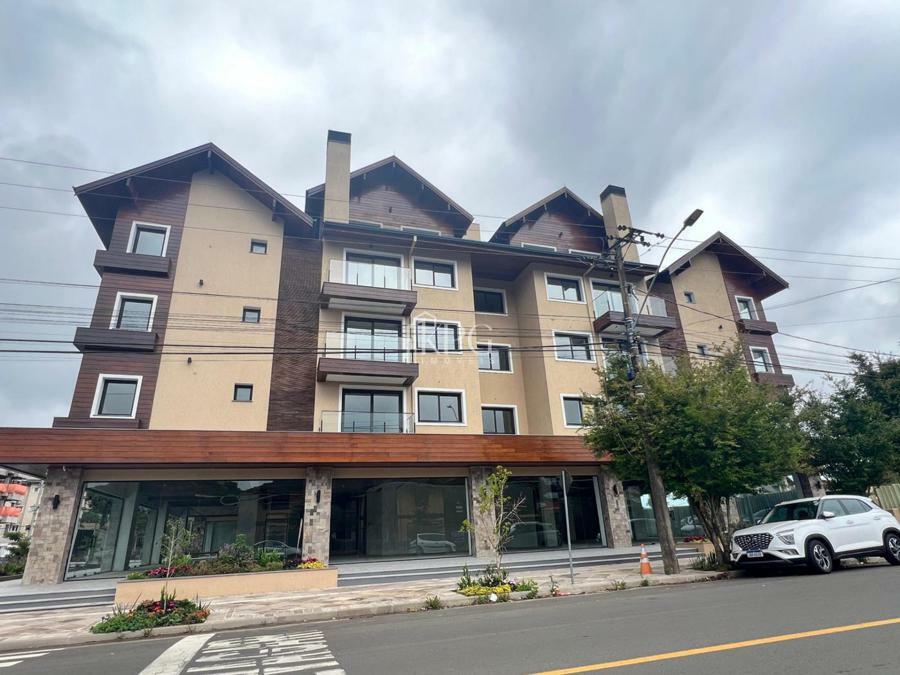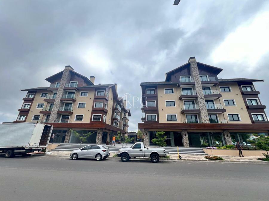 Apartamento dois dormitórios (uma suíte), banho social, living estar e jantar com espera para lareira, sacada, cozinha com churrasqueira e área de serviço.